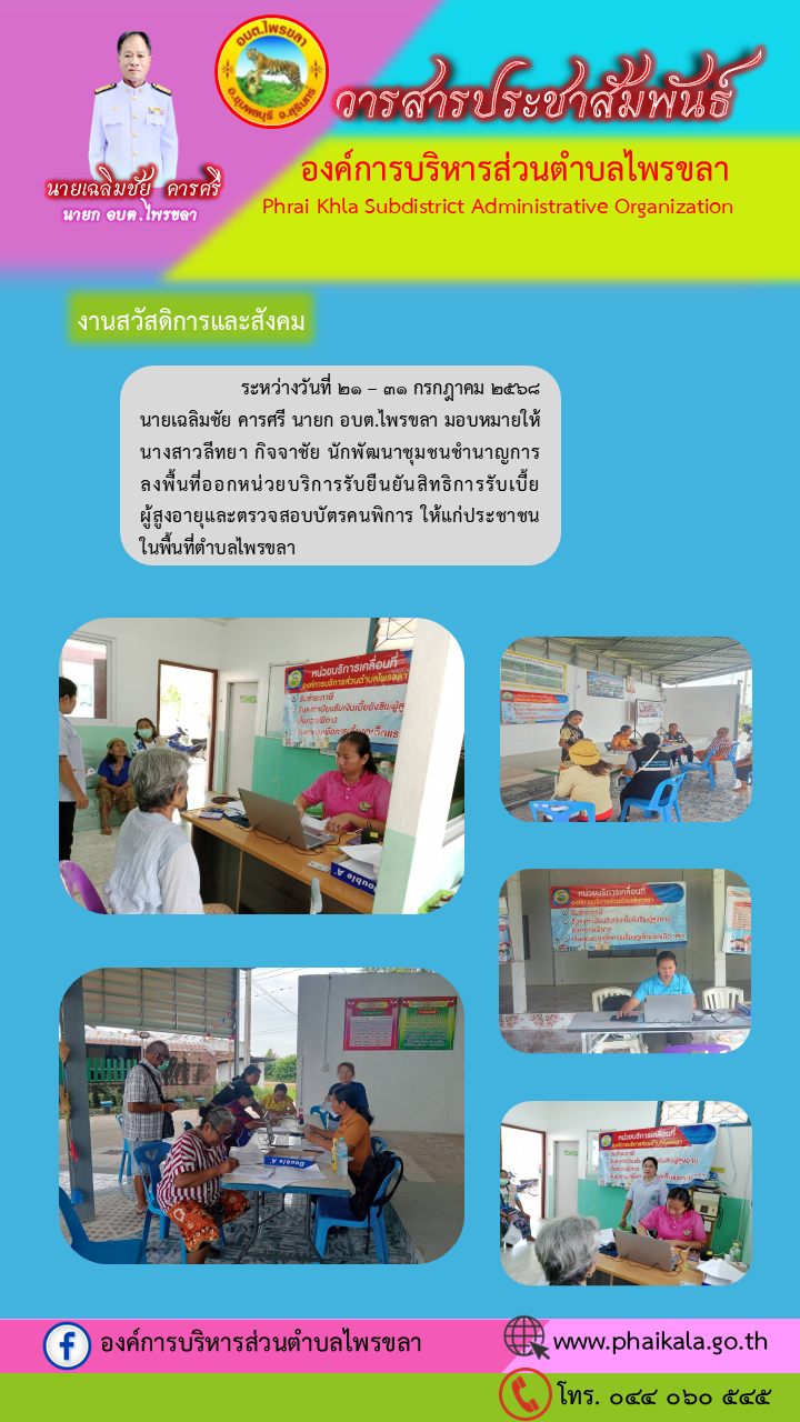 ออกหน่วยบริการรับยืนยันสิทธิการรับเงินเบี้ยยังชีพผู้สูงอายุและตรวจสอบบัตรคนพิการ ระหว่างวันที่ 21 – 31 กรกฎาคม 2568 นายเฉลิมชัย คารศรี นายก อบต.ไพรขลา มอบหมายให้ นางสาวลีทยา กิจจาชัย นักพัฒนาชุมชนชำนาญการ ลงพื้นที่ออกหน่วยบริการรับยืนยันสิทธิการรับเบี้ยผู้สูงอายุและตรวจสอบบัตรคนพิการ ให้แก่ประชาชนในพื้นที่ตำบลไพรขลา