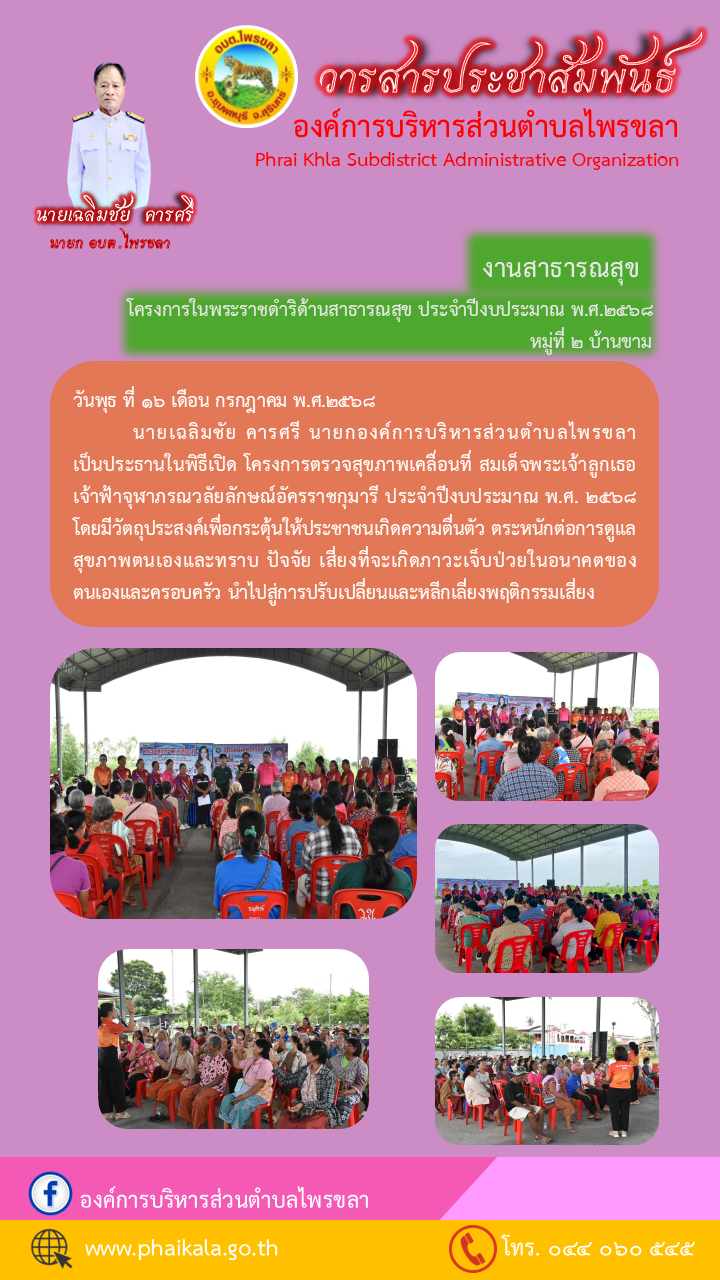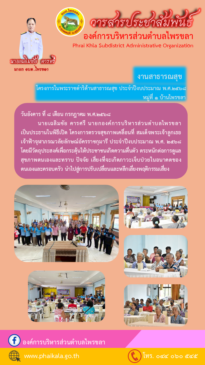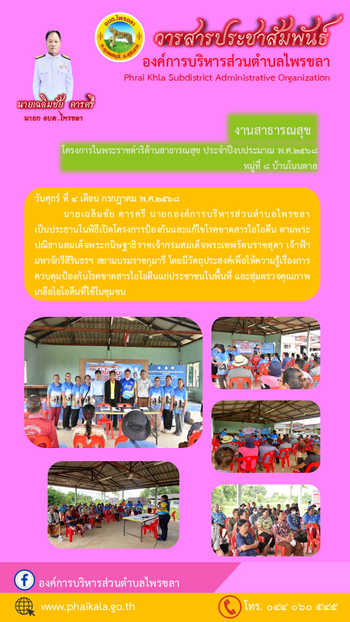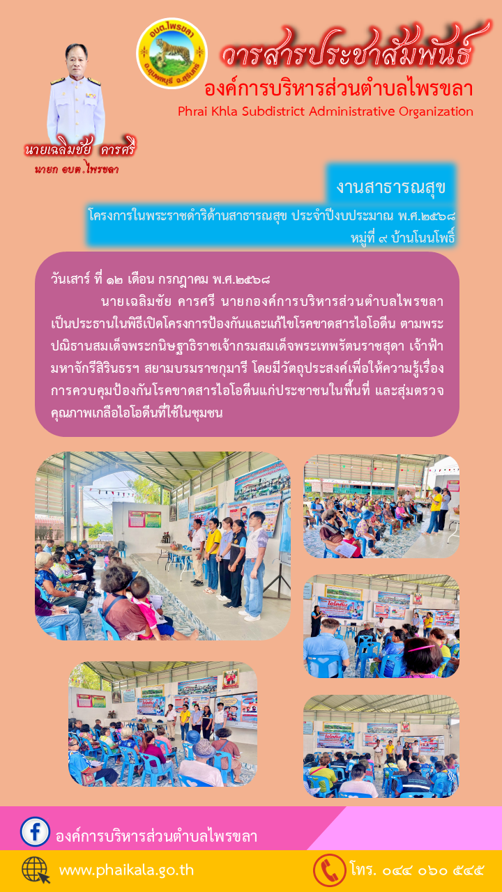 โครงการในพระราชดำริ ด้านสาธารณสุข ประจำปีงบประมาณ พ.ศ. 2568 องค์การบริหารส่วนตำบลไพรขลา อำเภอชุมพลบุรี จังหวัดสุรินทร์ ได้จัดสรรงบประมาณให้แก่หมู่บ้าน เพื่อดำเนินโครงการในพระราชดำริด้านสาธารณสุข ประจำปีงบประมาณ พ.ศ.2568 ดังนี้ หมู่ที่ 1 บ้านไพรขลา โครงการตรวจสุขภาพเคลื่อนที่ สมเด็จพระเจ้าลูกเธอเจ้าฟ้าจุฬาภรณวลัยลักษณ์อัครราชกุมารี ประจำปีงบประมาณ พ.ศ. 2568 หมู่ที่ 2 บ้านขาม โครงการตรวจสุขภาพเคลื่อนที่ สมเด็จพระเจ้าลูกเธอเจ้าฟ้าจุฬาภรณวลัยลักษณ์อัครราชกุมารี ประจำปีงบประมาณ พ.ศ. 2568 หมู่ที่ 3 บ้านโพนทัน โครงการสืบสานพระราชปณิธานสมเด็จย่า ต้านภัยมะเร็งเต้านม ประจำปีงบประมาณ พ.ศ. 2568 หมู่ที่ 4 บ้านไพรขลาน้อย โครงการป้องกันและแก้ไขโรคขาดสารไอโอดีน ตามพระปณิธานสมเด็จพระกนิษฐาธิราชเจ้ากรมสมเด็จพระเทพรัตนราชสุดา เจ้าฟ้ามหาจักรีสิรินธรฯ สยามบรมราชกุมารี หมู่ที่ 5 บ้านตาเฮอ โครงการส่งเสริมป้องกันและฟื้นฟูสุขภาพช่องปากกลุ่มประชาชนบ้านตาเฮอ หมู่ที่ ๖ บ้านโนนสมบูรณ์ โครงการรณรงค์และแก้ไขปัญหายาเสพติด “TO BE NUMBER ONE” หมู่ที่ 7 บ้านม่วงสวรรค์ โครงการรณรงค์และแก้ไขปัญหายาเสพติด “TO BE NUMBER ONE” หมู่ที่ 8 บ้านโนนตาล