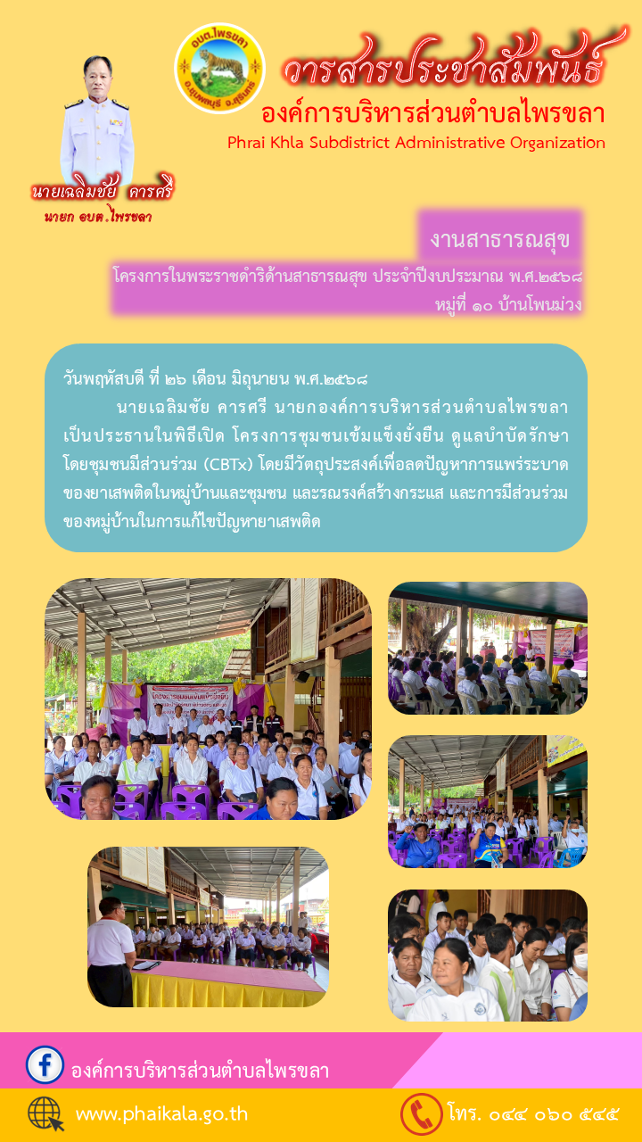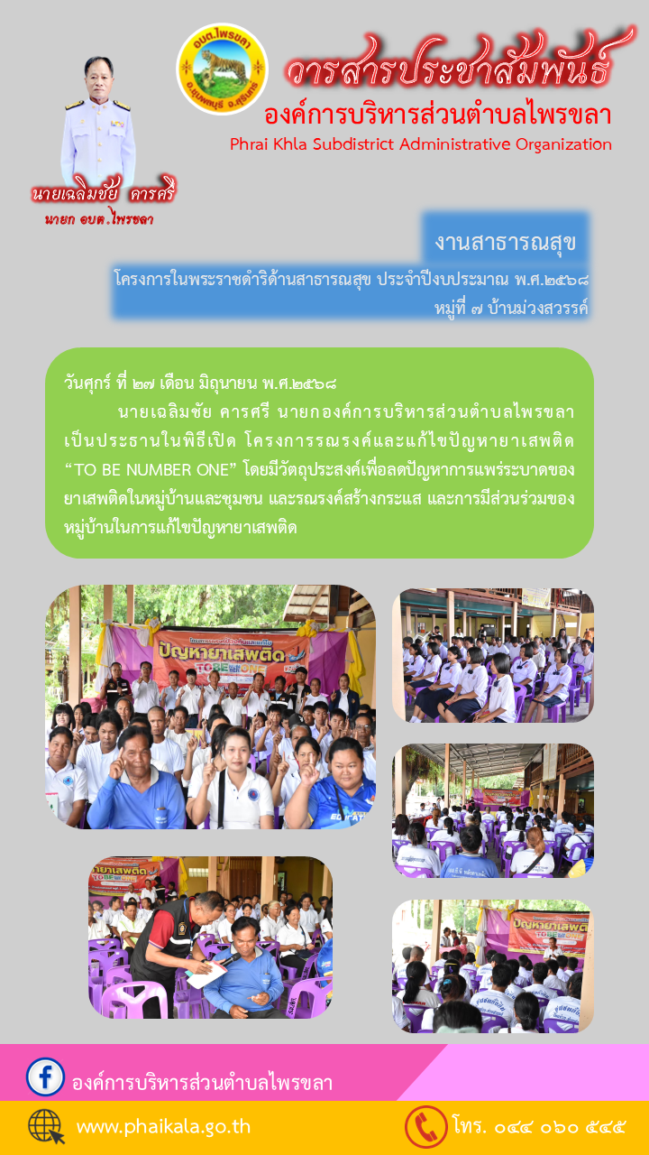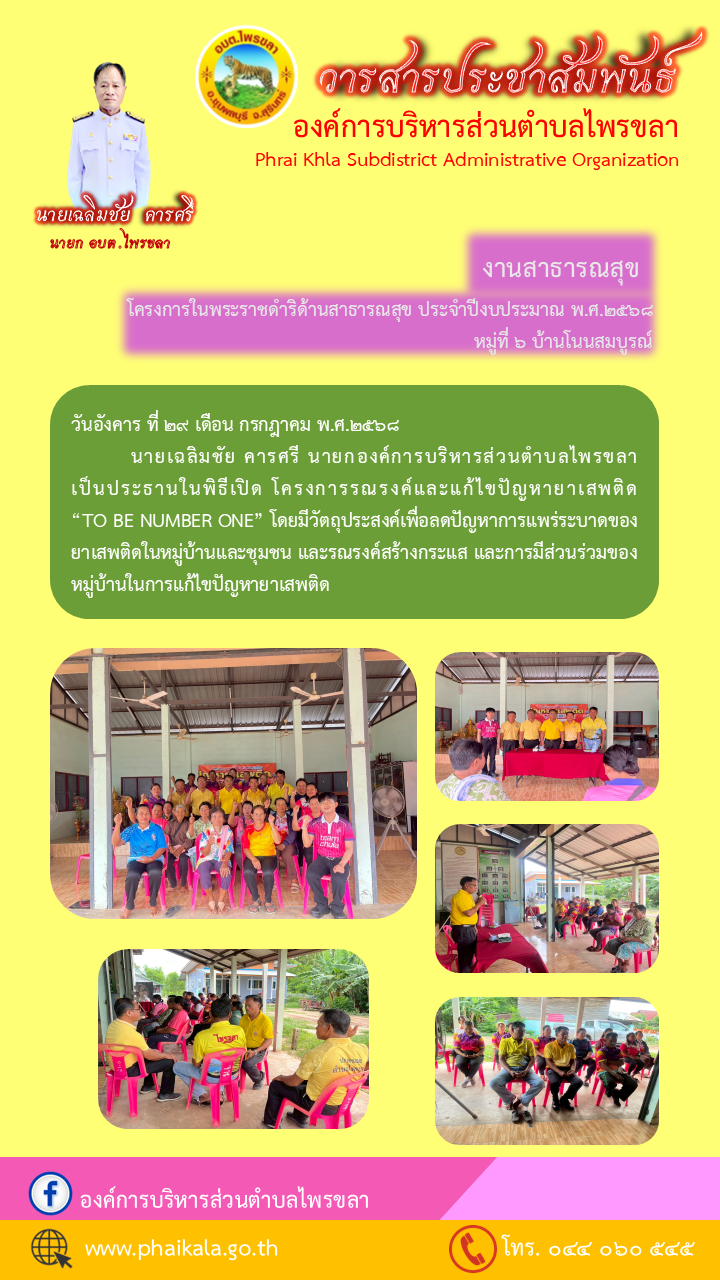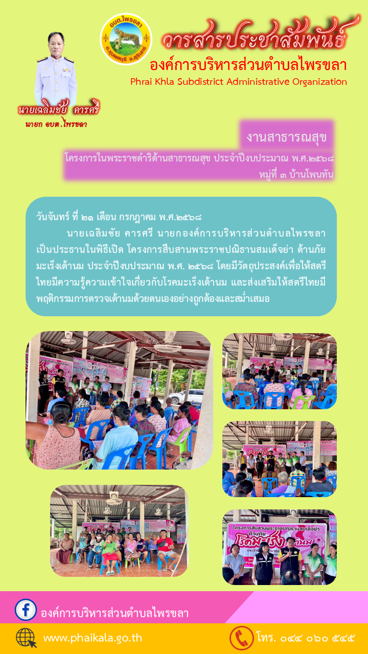 โครงการในพระราชดำริ ด้านสาธารณสุข ประจำปีงบประมาณ พ.ศ. 2568 องค์การบริหารส่วนตำบลไพรขลา อำเภอชุมพลบุรี จังหวัดสุรินทร์ ได้จัดสรรงบประมาณให้แก่หมู่บ้าน เพื่อดำเนินโครงการในพระราชดำริด้านสาธารณสุข ประจำปีงบประมาณ พ.ศ.2568 ดังนี้ หมู่ที่ 1 บ้านไพรขลา โครงการตรวจสุขภาพเคลื่อนที่ สมเด็จพระเจ้าลูกเธอเจ้าฟ้าจุฬาภรณวลัยลักษณ์อัครราชกุมารี ประจำปีงบประมาณ พ.ศ. 2568 หมู่ที่ 2 บ้านขาม โครงการตรวจสุขภาพเคลื่อนที่ สมเด็จพระเจ้าลูกเธอเจ้าฟ้าจุฬาภรณวลัยลักษณ์อัครราชกุมารี ประจำปีงบประมาณ พ.ศ. 2568 หมู่ที่ 3 บ้านโพนทัน โครงการสืบสานพระราชปณิธานสมเด็จย่า ต้านภัยมะเร็งเต้านม ประจำปีงบประมาณ พ.ศ. 2568 หมู่ที่ 4 บ้านไพรขลาน้อย โครงการป้องกันและแก้ไขโรคขาดสารไอโอดีน ตามพระปณิธานสมเด็จพระกนิษฐาธิราชเจ้ากรมสมเด็จพระเทพรัตนราชสุดา เจ้าฟ้ามหาจักรีสิรินธรฯ สยามบรมราชกุมารี หมู่ที่ 5 บ้านตาเฮอ โครงการส่งเสริมป้องกันและฟื้นฟูสุขภาพช่องปากกลุ่มประชาชนบ้านตาเฮอ หมู่ที่ ๖ บ้านโนนสมบูรณ์ โครงการรณรงค์และแก้ไขปัญหายาเสพติด “TO BE NUMBER ONE” หมู่ที่ 7 บ้านม่วงสวรรค์ โครงการรณรงค์และแก้ไขปัญหายาเสพติด “TO BE NUMBER ONE” หมู่ที่ 8 บ้านโนนตาล
