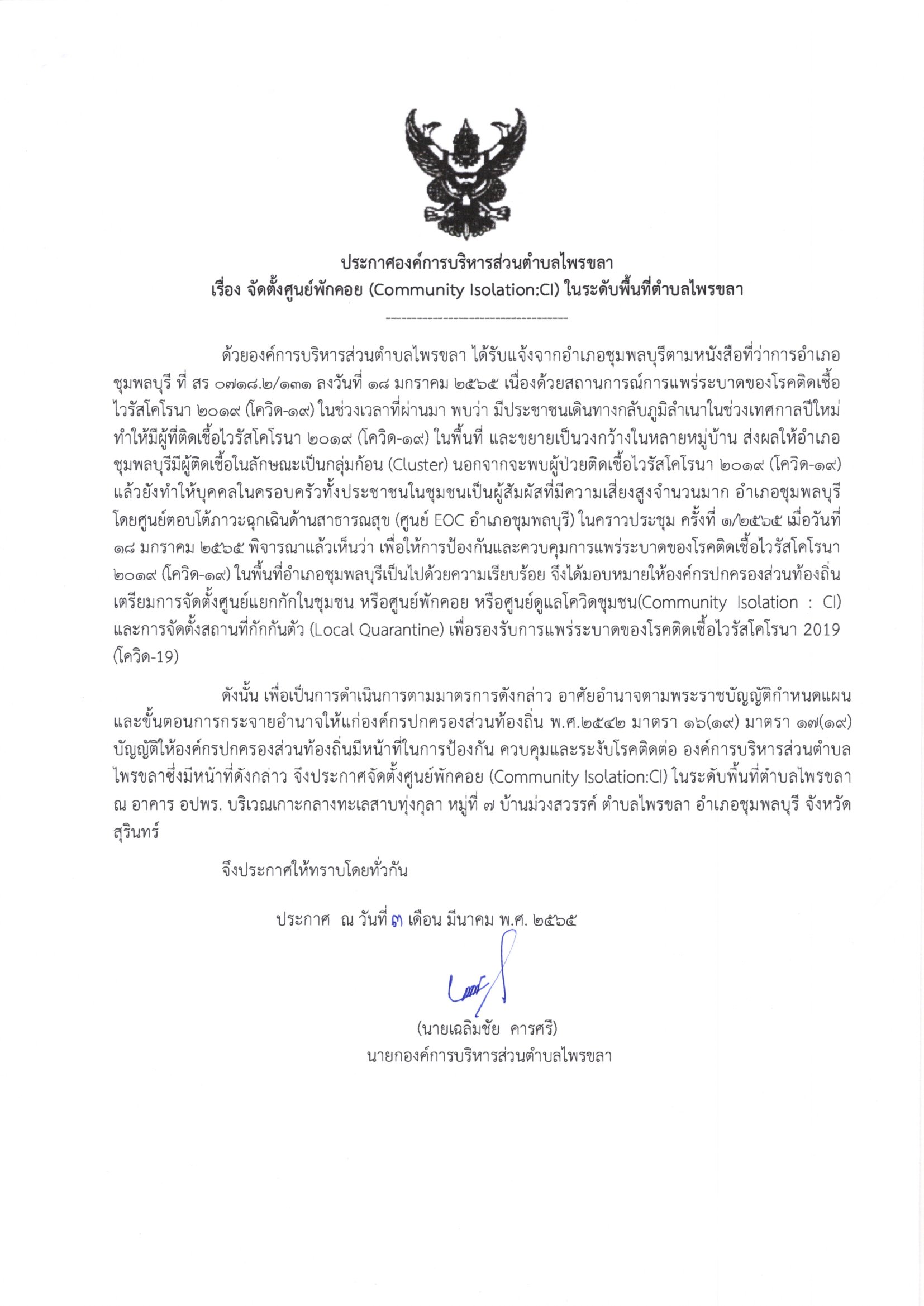 ประกาศจัดตั้งศูนย์พักคอย (Community Isolation:CI) ในระดับพื้นที่ตำบลไพรขลา